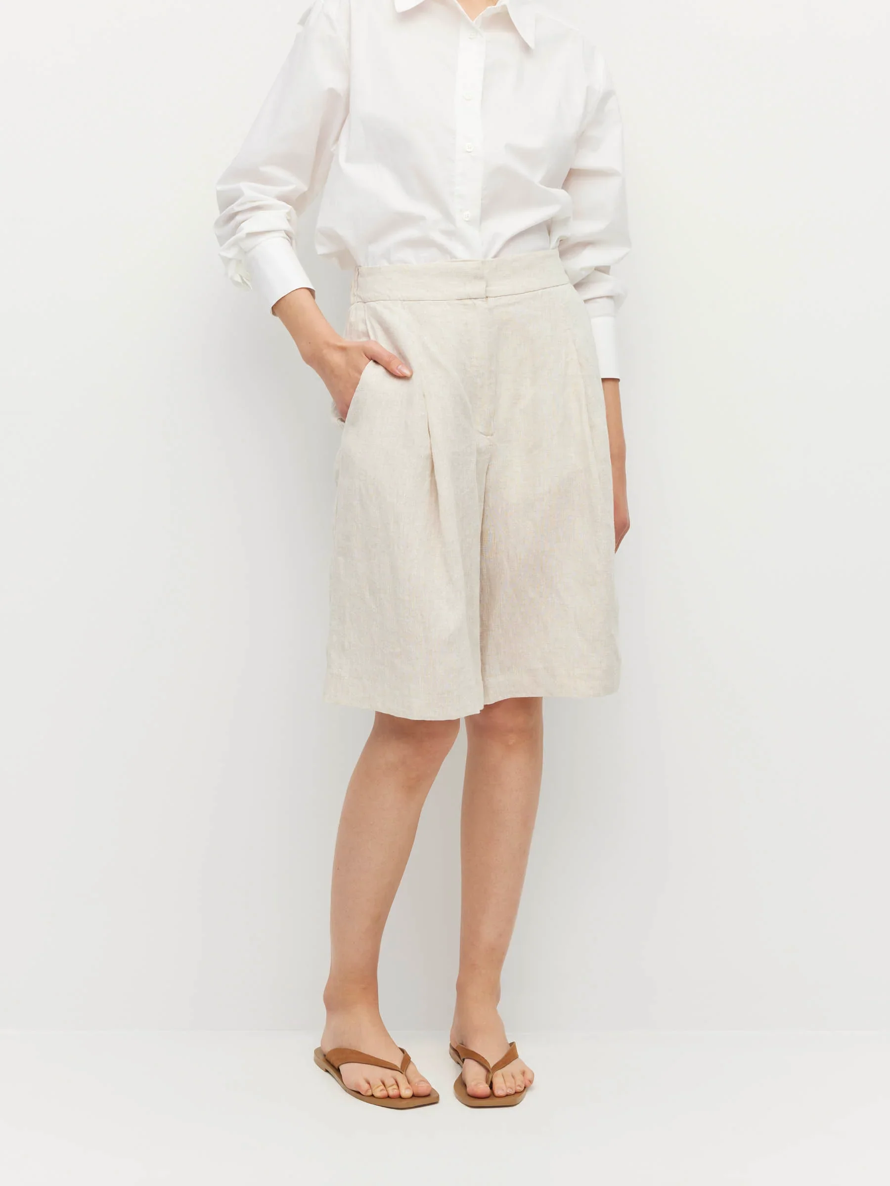 Both classic and practical, the Halina Shorts feature a pleat front and a modest hem finishing at the knee. Complete with side and back pockets, they pair perfectly with the matching Mimi Jacket for a chic summer look
