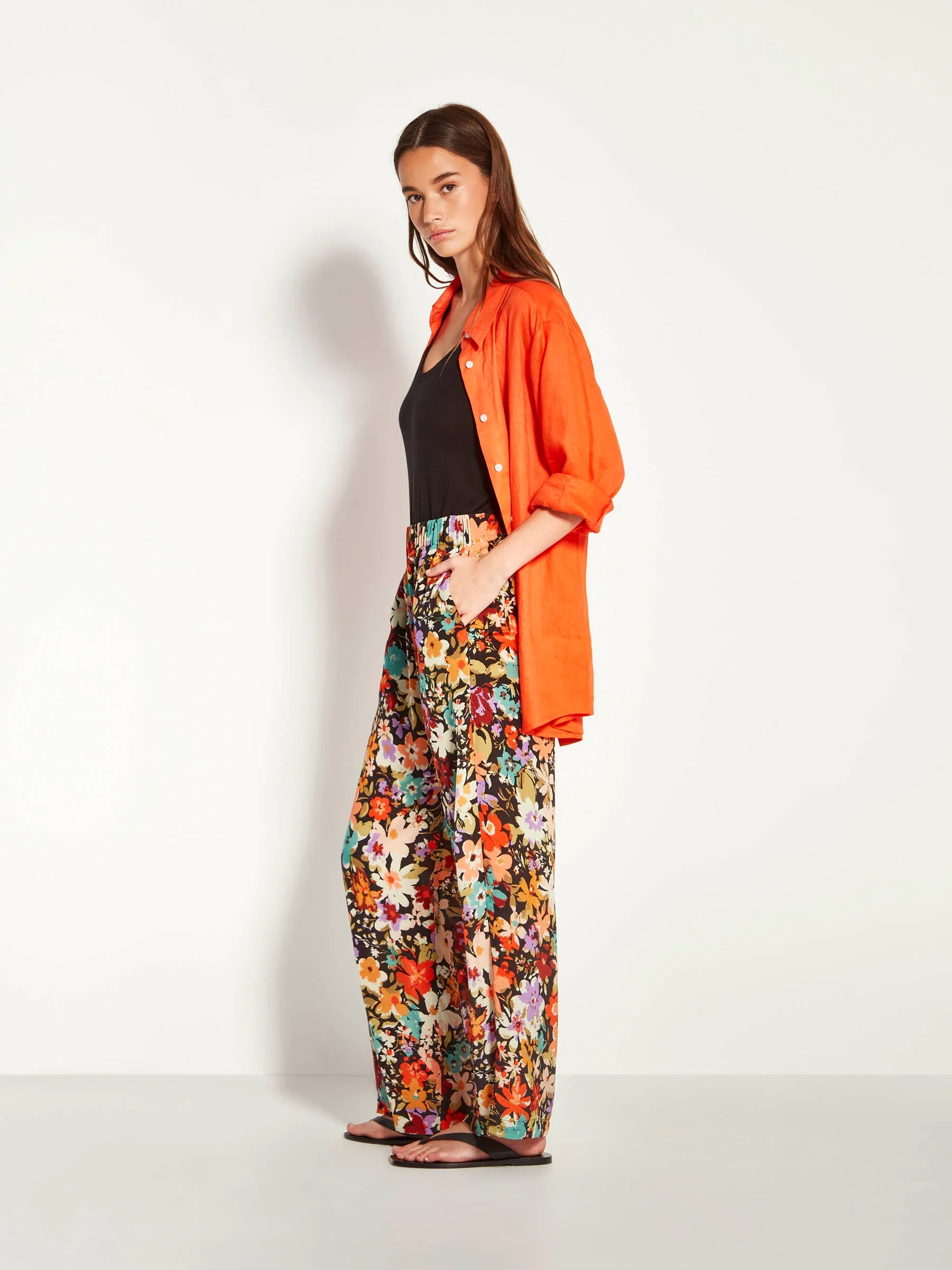 A luxurious wide-leg pant that sits high on the hips and fluidly falls to the ground. Featuring an elasticated waist, pockets, and a relaxed fit, the Pia Pant in Petal Parade Silk is a bright and joyous pant that looks great worn with the matching Fancy T, or dressed down with a relaxed shirt and tankIn house print